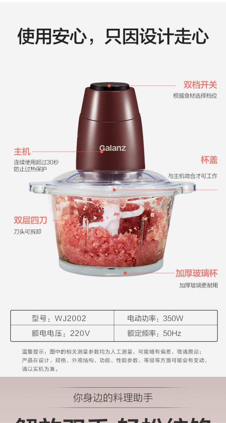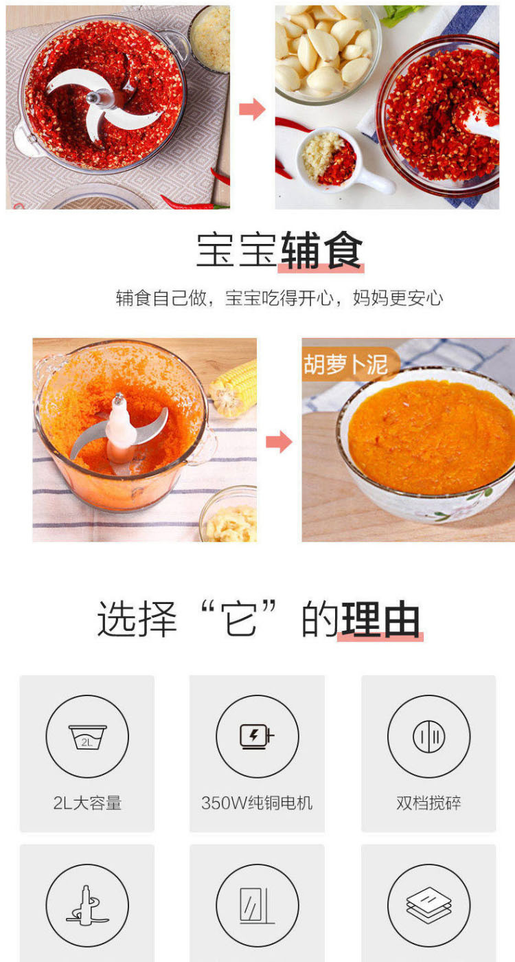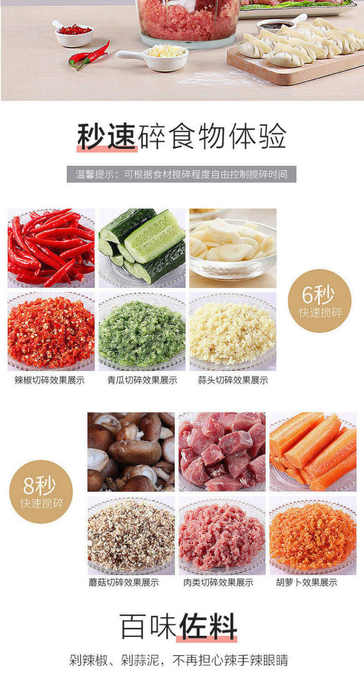 功能: 切菜,和馅,绞辣椒,绞肉,绞蒜