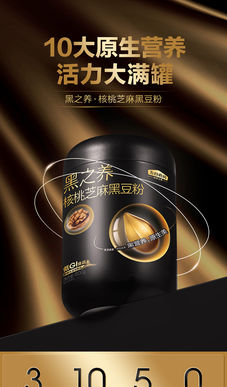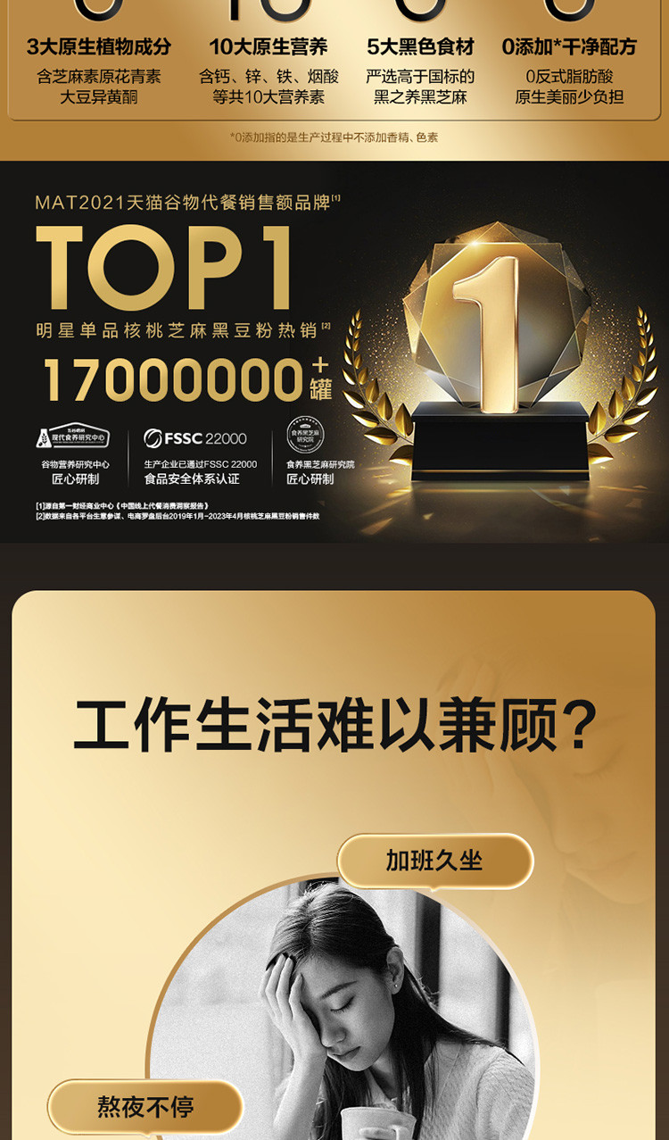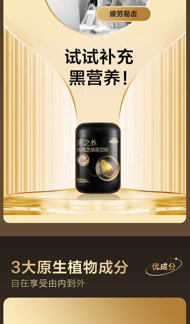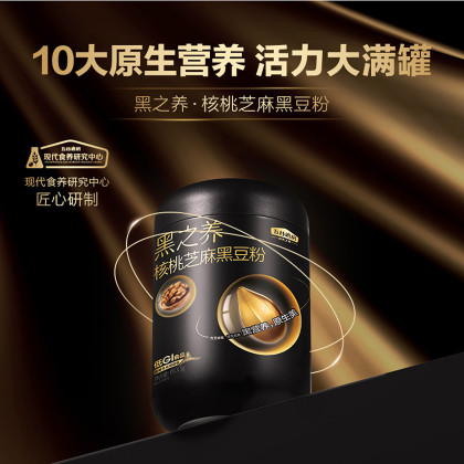 成分信息: 黑大豆、黑艺麻黑米、糙米、燕麦片、红枣干、核桃仁、山药、奇亚籽、黑黎麦 ]结品果糖 (黑芝麻、黑大豆、奇亚籽、黑米、黑黎赛)含量 >65%,其中黑芝麻含量>27%